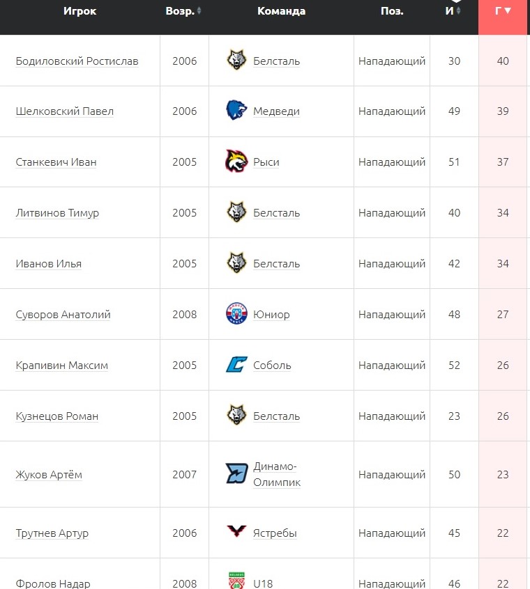 Нападающий «Белстали» Ростислав Бодиловский (2006) с 40 голами стал лучшим снайпером регулярного чемпионата Betera-Высшей лиги в сезоне-2025/26. В топ-3 вошли также Павел Шелковский (2006) («Медведи») – 39 шайб и Иван Станкевич («Рыси») – 37.