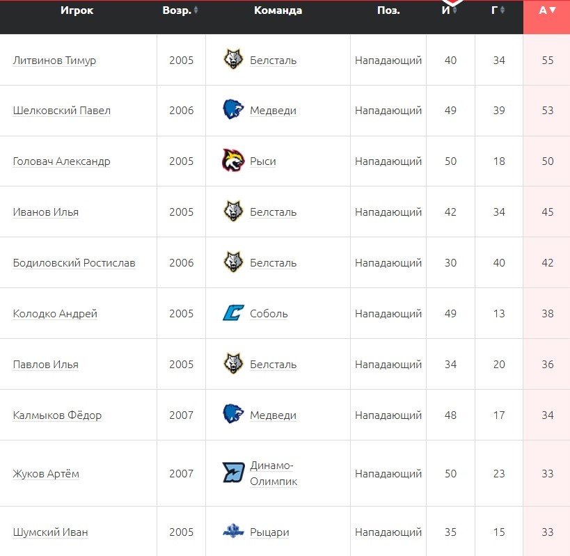 Лидером по числу ассистентских баллов стал нападающий «Белстали» Тимур Литвинов (2005), на счету которого 55 голевых передач. В топ-3 оказались Павел Шелковский (2006) («Медведи») – 53, а также Александр Головач («Рыси») – 50.