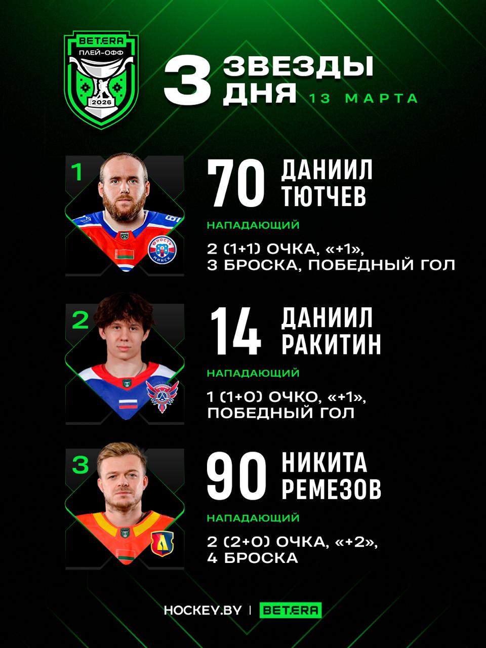 Вчера, 13 марта, в Betera-Экстралиге прошли два матча четвертьфинальных серий плей-офф. Редакция Hockey.by выбрала лучших игроков дня.