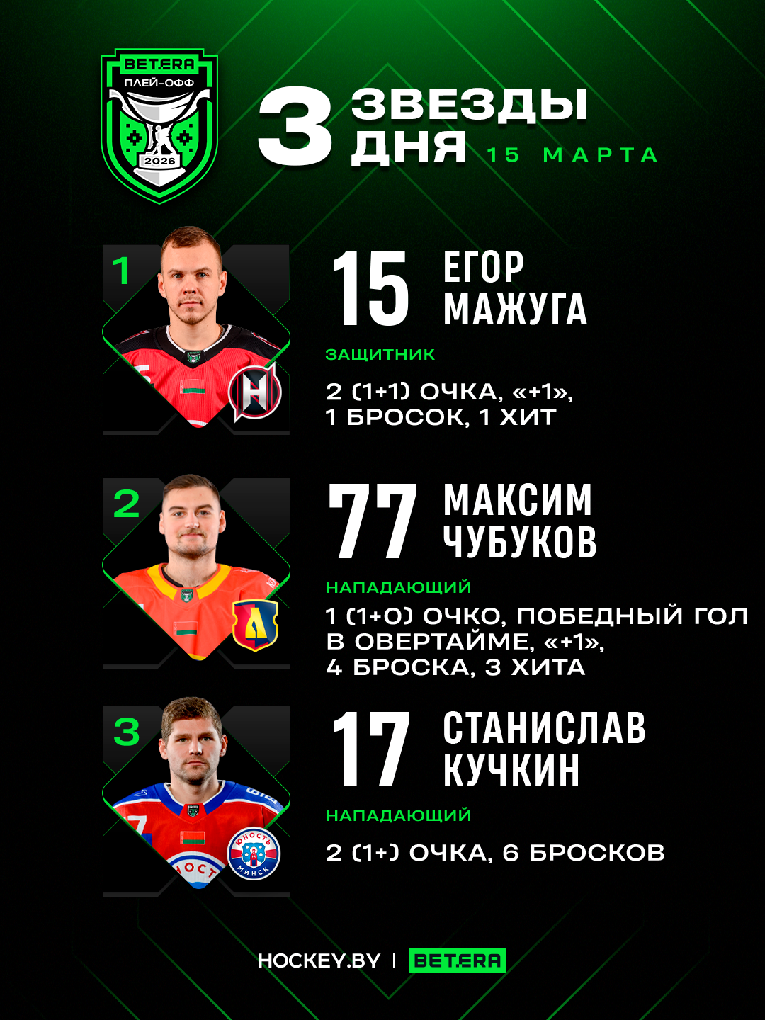15 марта в Betera-Экстралиге прошли два матча четвертьфинальных серий плей-офф. Редакция Hockey.by выбрала лучших игроков дня.