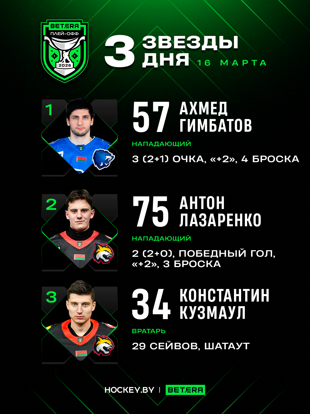 16 марта в Betera-Экстралиге прошли два матча четвертьфинальных серий плей-офф. «Витебск» обыграл «Металлург» (4:2, 1-1 в серии), «Гомель» справился с «Шахтером» (4:0, 1-1 в серии). Редакция Hockey.by выбрала лучших игроков дня.