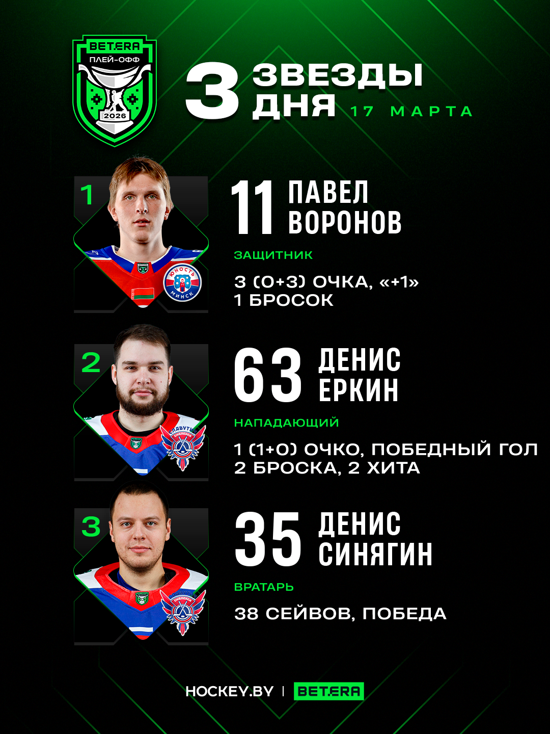 Павел Воронов, Денис Еркин и Денис Синягин – три звезды вторника в плей-офф Betera-Экстралиги