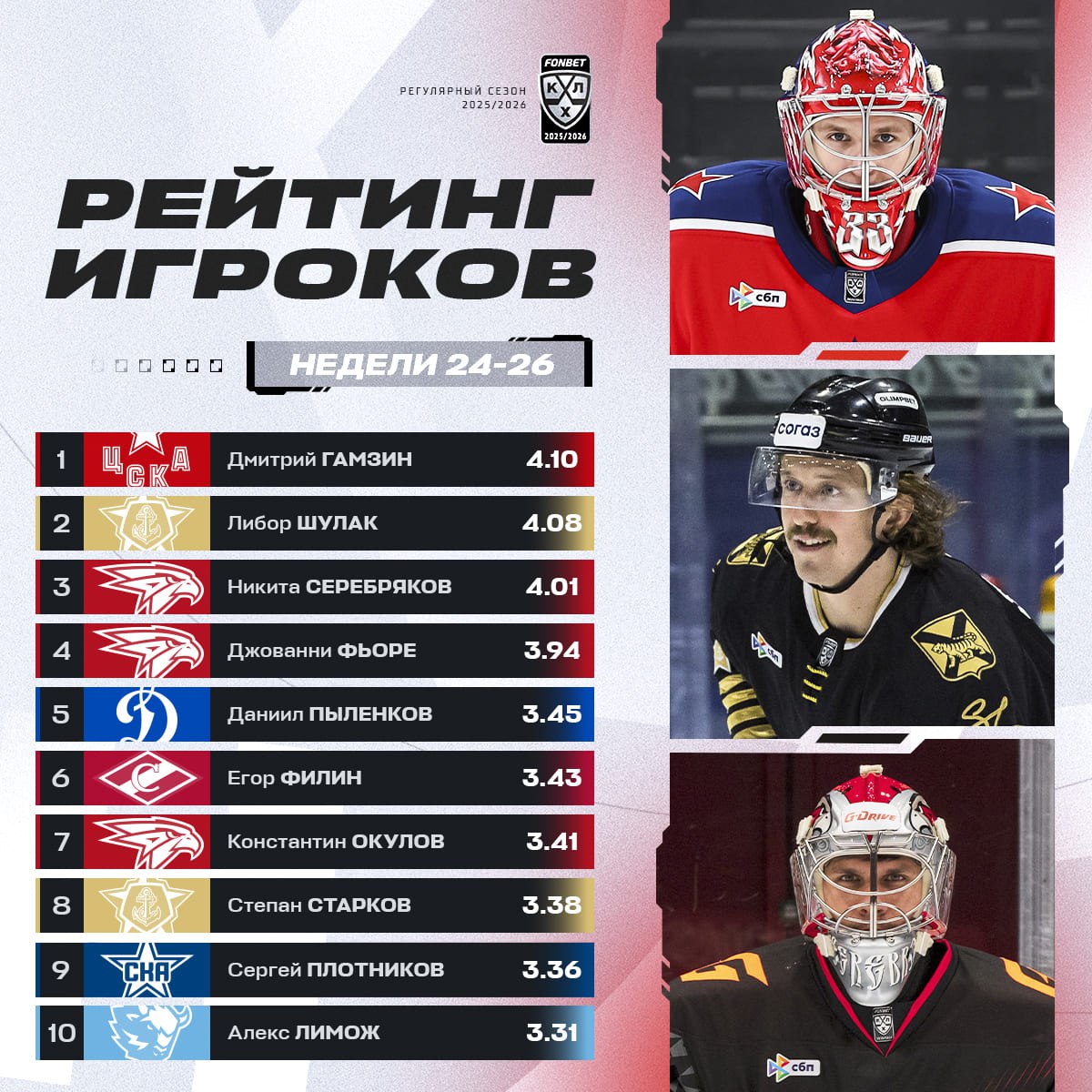 KHL.ru представляет десятку лучших хоккеистов по итогам 24-26 недель чемпионата. В этом рейтинге снова расположился нападающий Алекс Лимож. Показатель Алекса составил 3.31.
