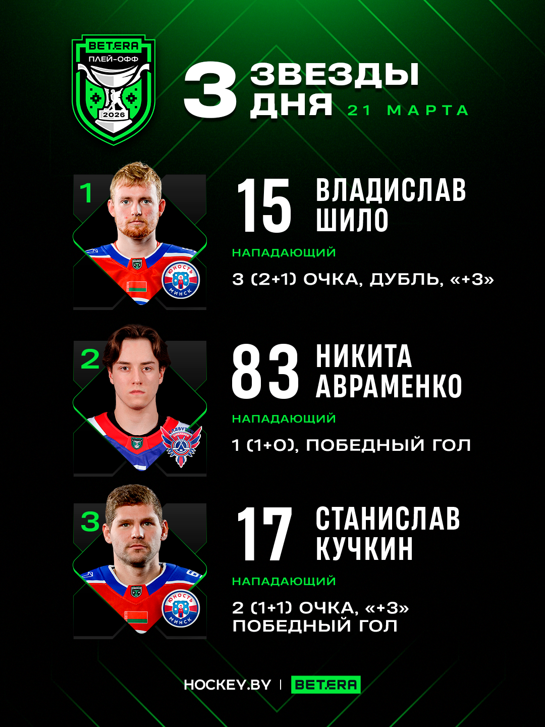 Владислав Шило, Никита Авраменко и Станислав Кучкин – три звезды субботы в четвертьфинальном раунде Betera-Экстралиги