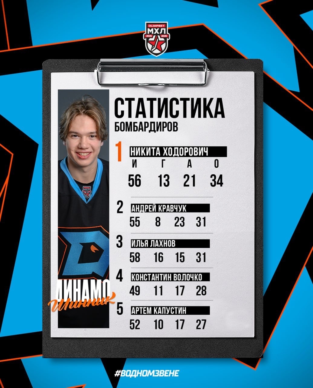 Нападающий Никита Ходорович, как и год назад, вошел в топ-3 лучших бомбардиров «Динамо-Шинника». Причем в этом году он возглавил список с 34 (13+21) очками в 56 матчах. Он же – лучший в команде по показателю полезности (+22).