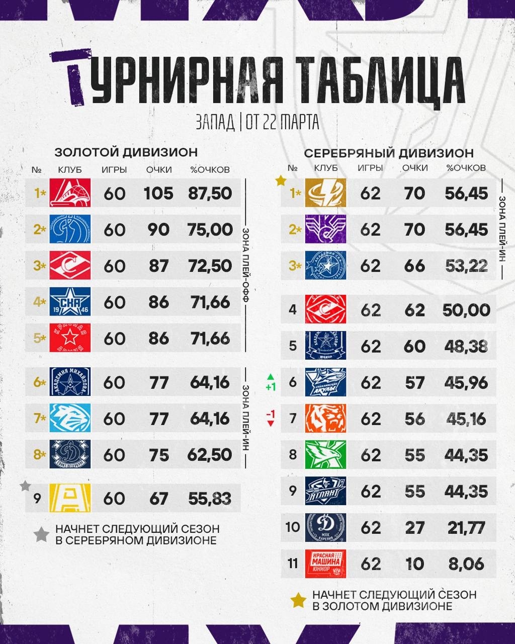Завершился четвертый регулярный чемпионат «Динамо-Шинника» после возвращения в МХЛ. В нем команда Евгения Летова деьбтировала в Золотом дивизионе. Впрочем, сезон для «бобров» не закончен – в раунде плей-ин до 2 побед они сразятся со второй командой Серебряного дивизиона, московскими Крыльями Советов, за выход в плей-офф. Кроме того, победитель этого противостояния гарантирует себе место в Золотом дивизионе на следующий сезон. Первый матч пройдет 25 марта в Москве, 28 марта соперники сыграют в Бобруйске, а если потребуется третий поединок, то он состоится 29 марта на льду «бобров».