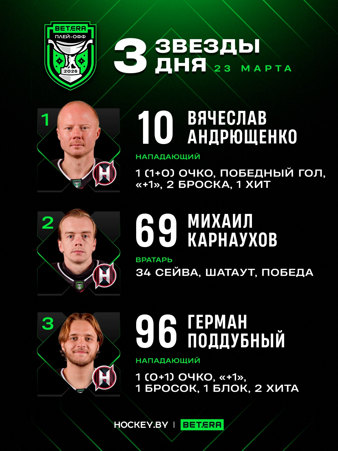 Вячеслав Андрющенко, Михаил Карнаухов и Герман Поддубный – три звезды понедельника в четвертьфинальном раунде плей-офф Betera-Экстралиги
