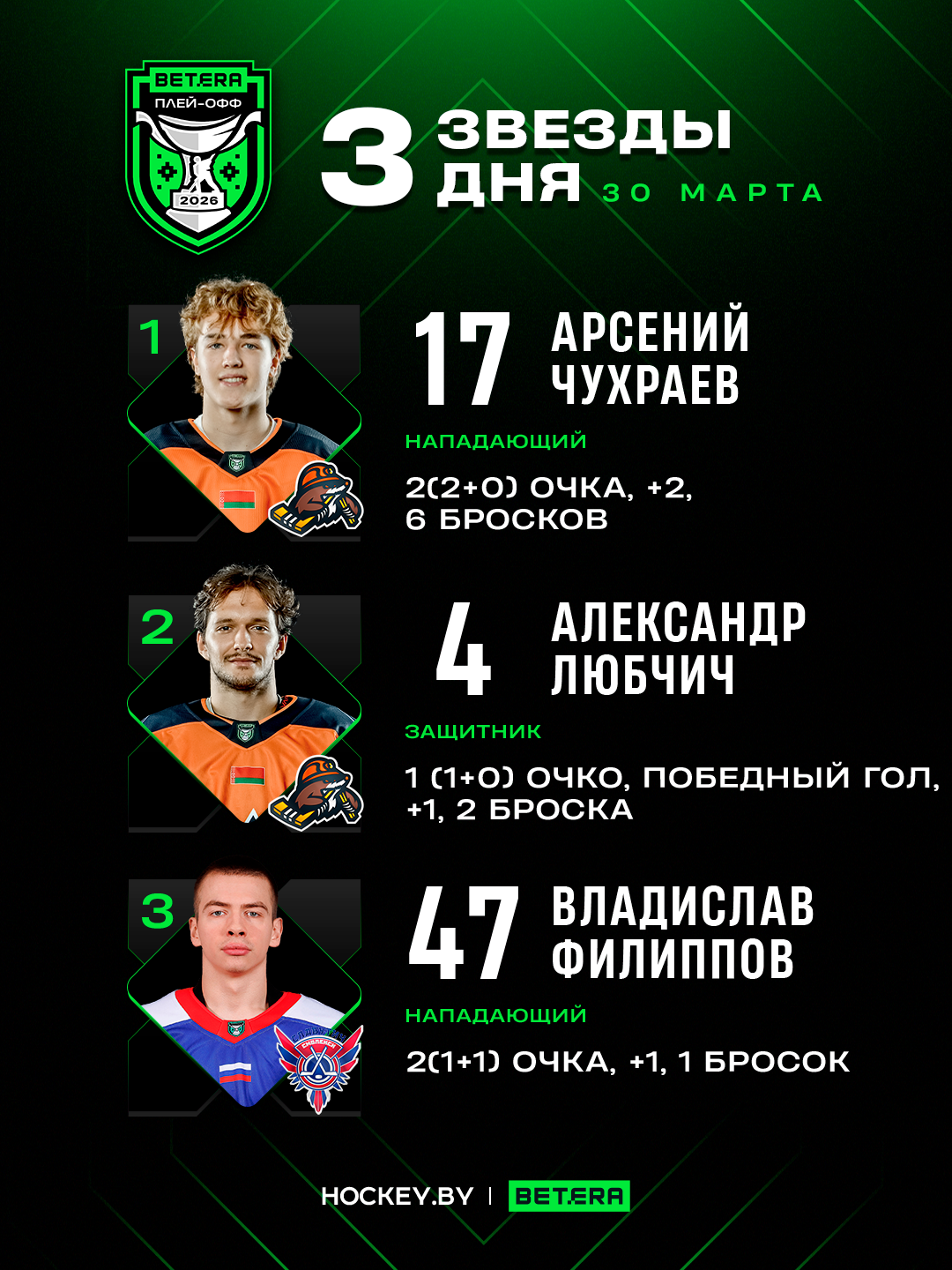 Арсений Чухраев, Александр Любчич и Владислав Филиппов – три звезды понедельника в плей-офф Betera-Экстралиги