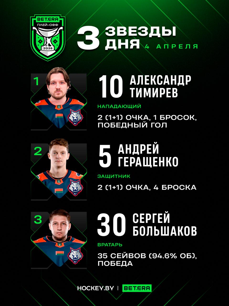 Александр Тимирев, Андрей Геращенко, Сергей Большаков – три звезды субботы в полуфинальном раунде плей-офф Betera-Экстралиги