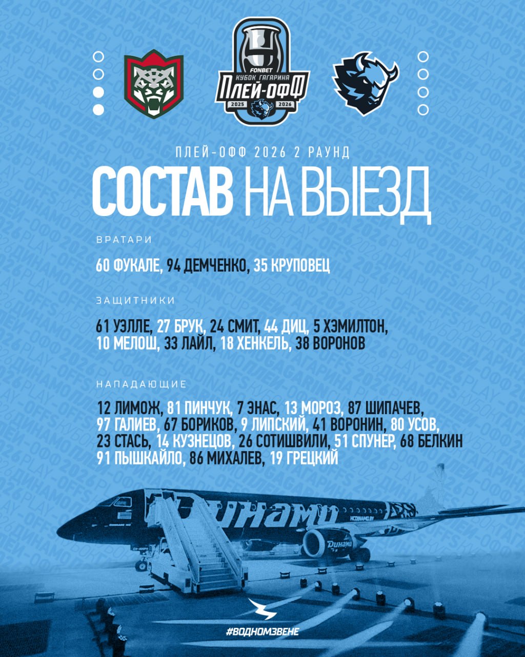 Пресс-служба минского «Динамо» опубликовала выездной состав на предстоящие матчи второго раунда плей-офф с «Ак Барсом». Всего в Казань отправились 30 хоккеистов.