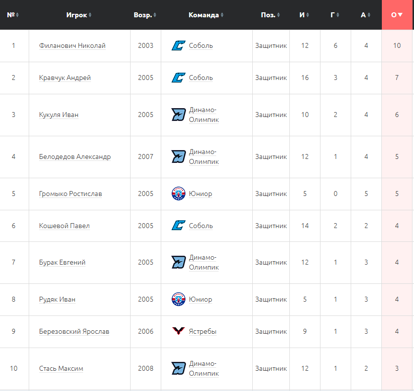 Николай Филанович (2003) из «Соболя» стал лучшим бомбардиром-защитником плей-офф Betera-Высшей лиги в сезоне-2025/26. На его счету 10 (6+4) очков в 12 матчах. В тройку лучших вошли защитник «Соболя» Андрей Кравчук (2005) – 7 (3+4) очков в 16 поединках и игрок обороны «Динамо-Олимпика» Иван Кукуля (2005) – 6 (2+4) баллов в 10 играх.