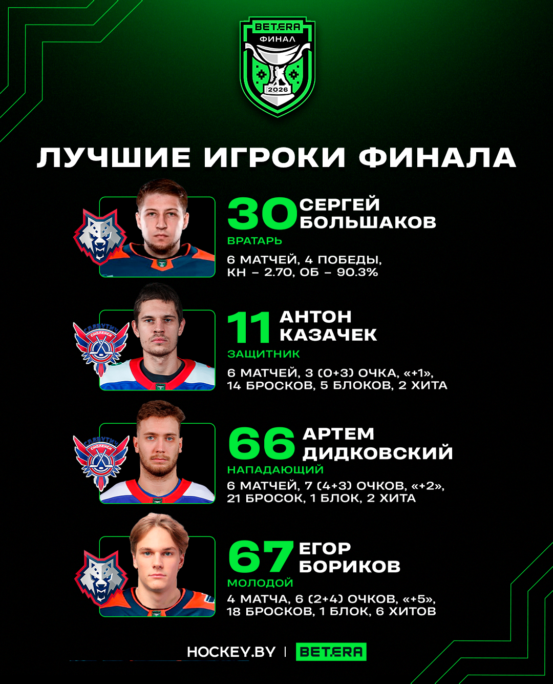 Сергей Большаков, Антон Казачек, Артем Дидковский и Егор Бориков – лучшие игроки финального раунда Betera-Экстралиги