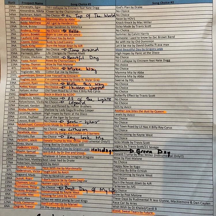 19:46. Кстати, вчера официальный инстаграм НХЛ опубликовал фото со списком песен, под которые собирались выходить выбранные в первом раунде хоккеисты. Многие, как и Владислав Колячонок, по этому поводу особо не парились.