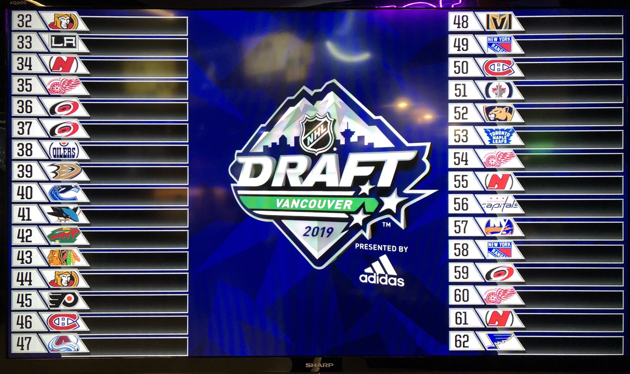 10 picks to go. Выбрать осталось «Торонто», «Сент-Луису», «Айлендерс», «Нэшвиллу», «Сан-Хосе», «Коламбусу», «Тампе», «Ванкуверу», «Калгари» и «Каролине».