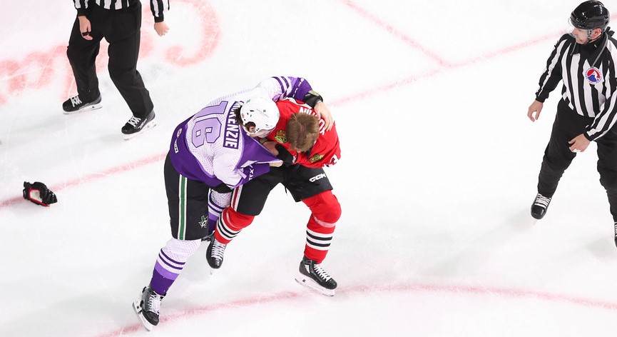 Белорусский 22-летний защитник «Рокфорда» Дмитрий Кузьмин (177 см, 85 кг) на 38-й минуте подрался с 34-летним форвардом «Техаса» Кертисом Маккензи (188 см, 93 кг) – сразу после того, как канадец сделал счет 2:0 в пользу хозяев. За этот эпизод Кузьмин получил 7 (2+5) минут штрафа, Маккензи, который вот уже пятый сезон кряду является капитаном «Техаса», судьи выписали 5 минут.